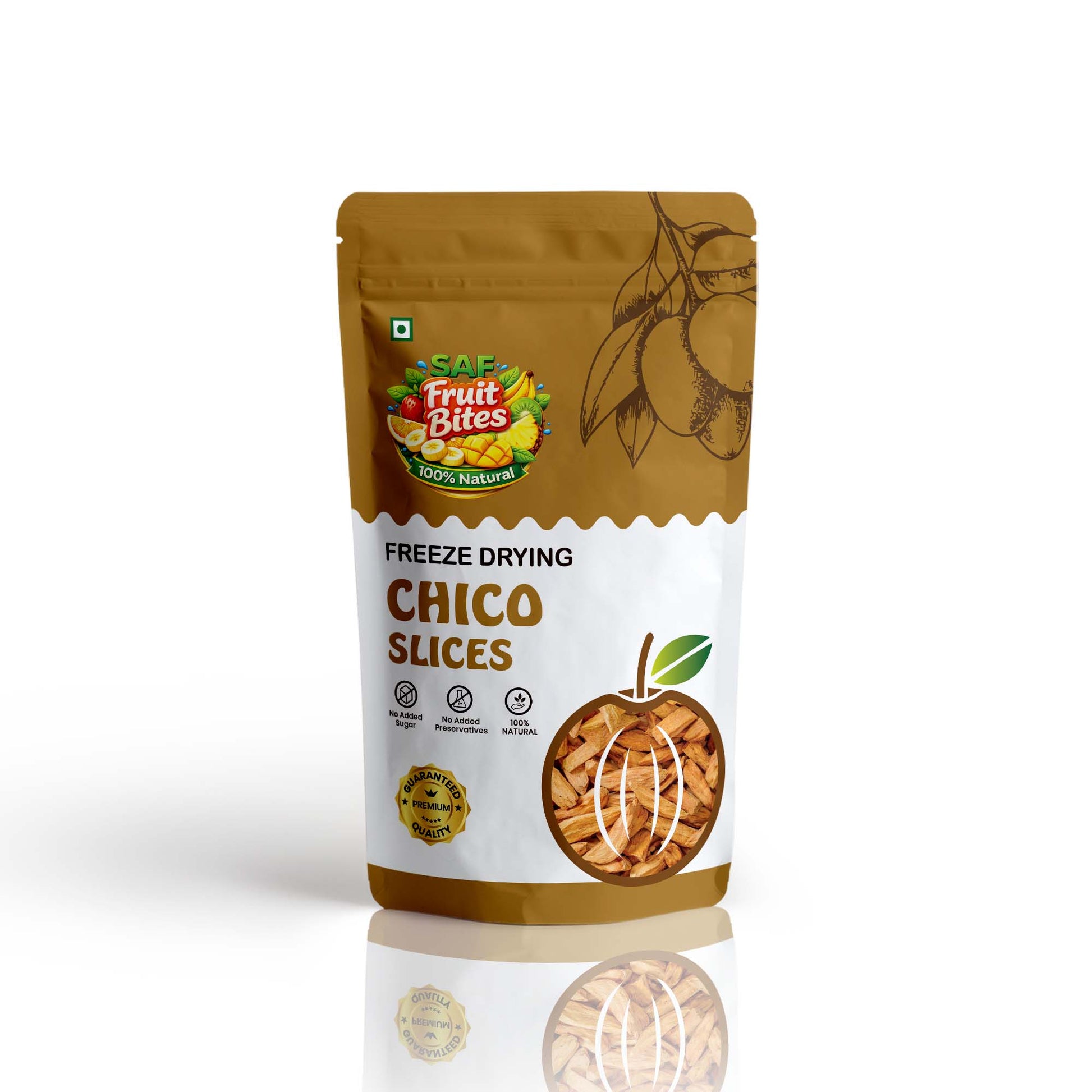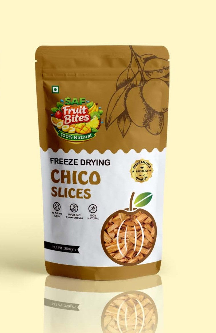 Freeze-Dried Chikoo (Sapota) Slices are made from carefully selected ripe chikoo fruits processed using the freeze-drying method, which removes moisture while preserving the fruit’s natural sweetness, flavour, colour, and nutrients. No added sugar, preservatives, or artificial additives are used.