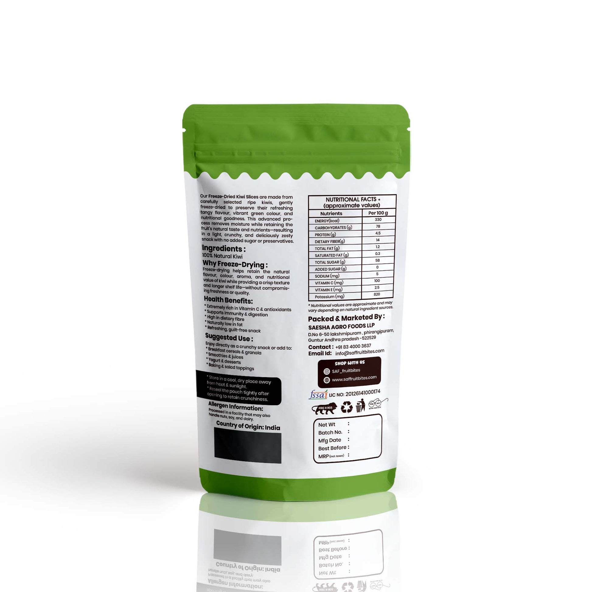 For infant safety and FSSAI compliance, freeze-dried kiwi slices must be positioned as a “complementary food ingredient” or “fruit ingredient for toddlers (8+ months)”, not as a direct snack for younger infants.