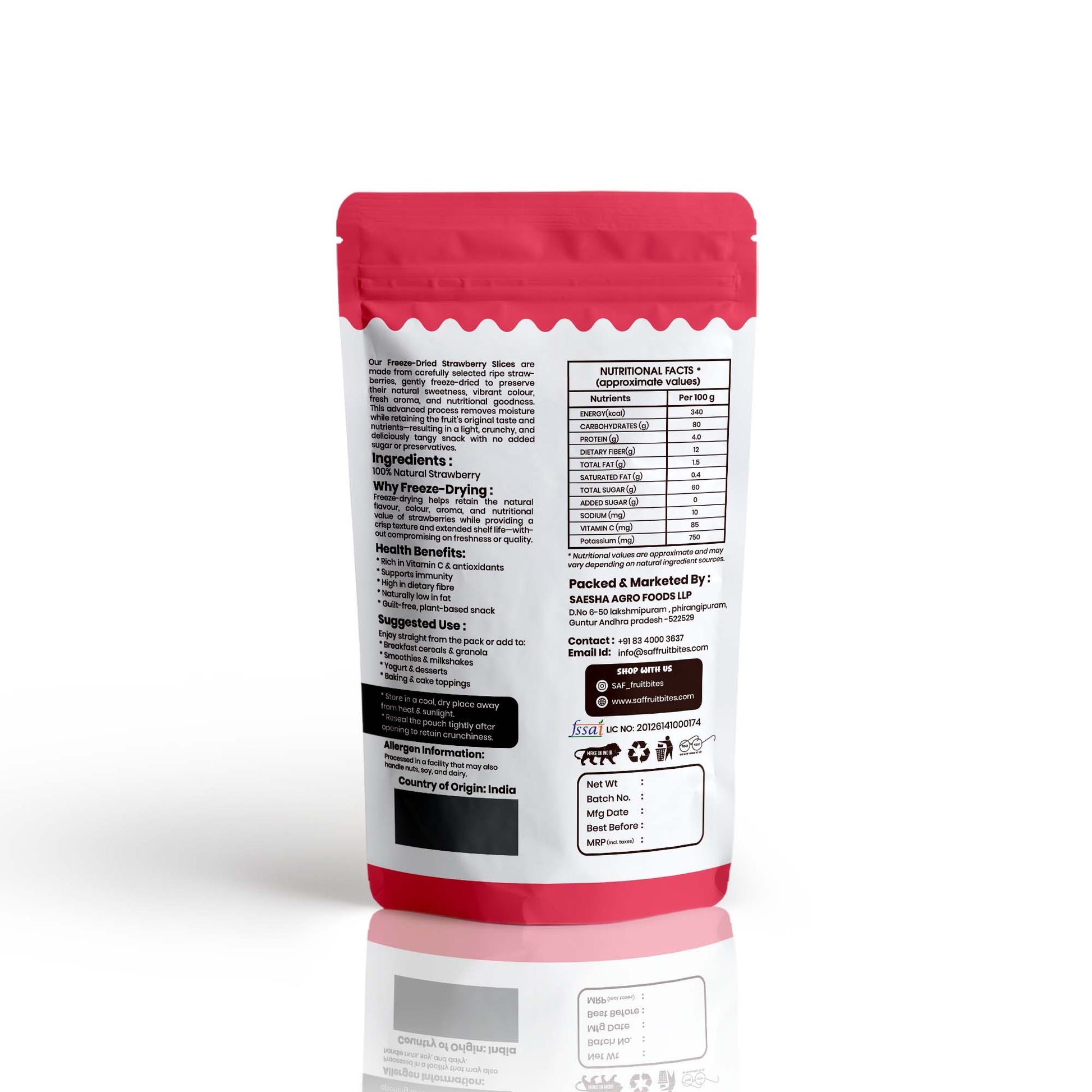 For infant safety and FSSAI compliance, freeze-dried strawberry slices must be positioned as a “complementary food ingredient” or “fruit ingredient for toddlers (8+ months)”, not as a direct snack for younger infants.